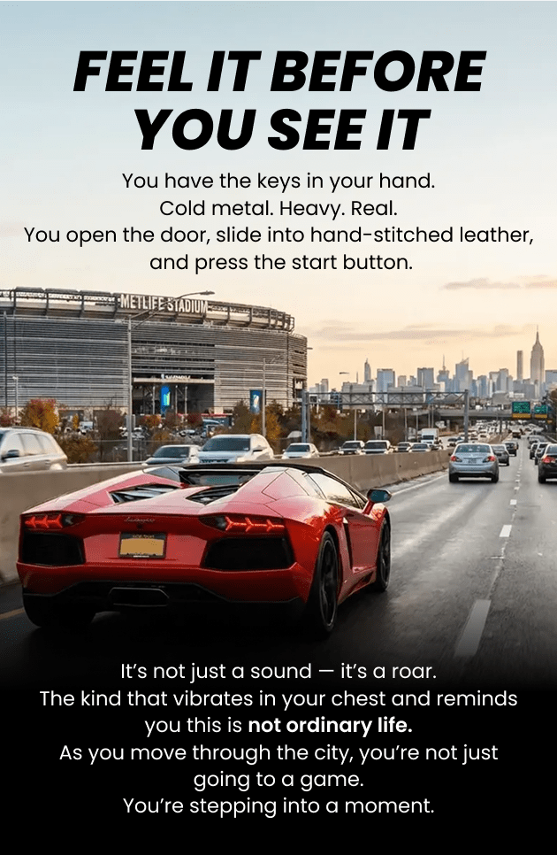 You have the keys in your hand.Cold metal. Heavy. Real.You open the door, slide into hand-stitched leather, and press the start button.